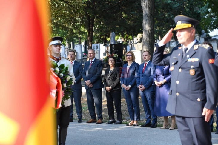 Shkup, 18 gusht – Delegacioni i Qeverisë së Republikës së Maqedonisë së Veriut, i përbërë nga zëvendëskryeministrja përgjegjëse për Politika të Qeverisjes së Mirë, Sllavica Gërkovska dhe zëvendësministri i Shoqërisë Informatike dhe Administratës, Aleksandar Bajdevski, sot vendosi lule në varrezat partizane në Butel, në varrezat e gjeneralit Mihajlo Apostolski dhe presidentëve të ndjerë të shtetit dhe komandantë suprem të Armatës, Kiro Gligorov dhe Boris Trajkovski, me rastin e Ditës së Armatës.