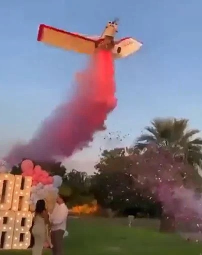 Aeroplani, që shpërndau tymin rozë për të treguar se çifti do të bëheshin prindër të një vajzë, u rrëzuaduke lënë të vdekur në vend pilotin.