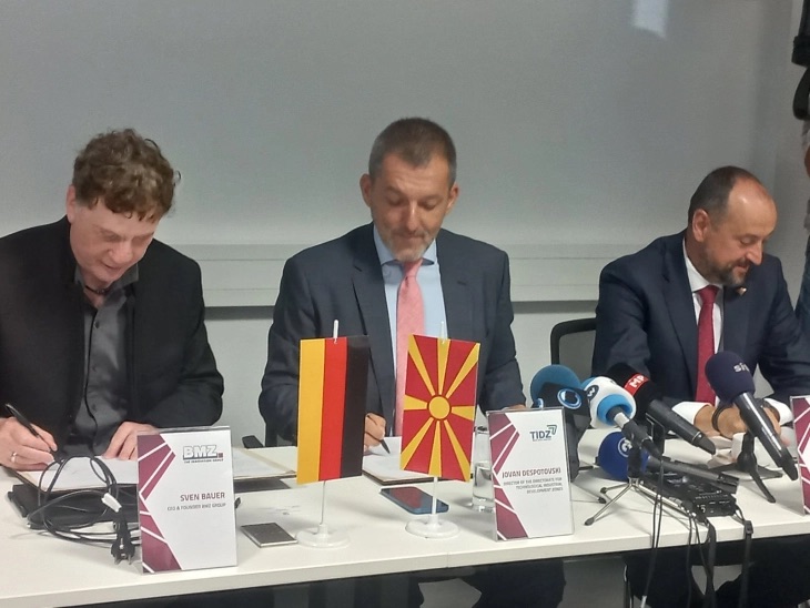 Marrëveshja për investimin sot në selinë e kompanisë në Frankfurt nga drejtori ekzekutiv dhe themelues i BMZ, Sven Bauer dhe nga drejtori i Drejtorisë së Zonave Zhvillimore Industriake Teknologjike (ZZHTI) Jovan Despotovski, në praninë e zëvendëskryeministrit Bytyqi she Jelica Ivanovska, menaxhere e përgjithshme e BMZ Maqedoni.