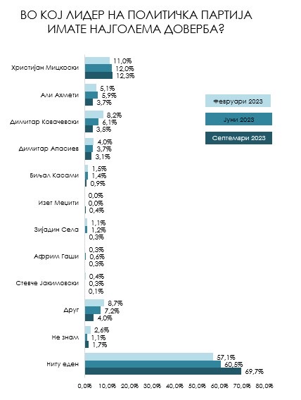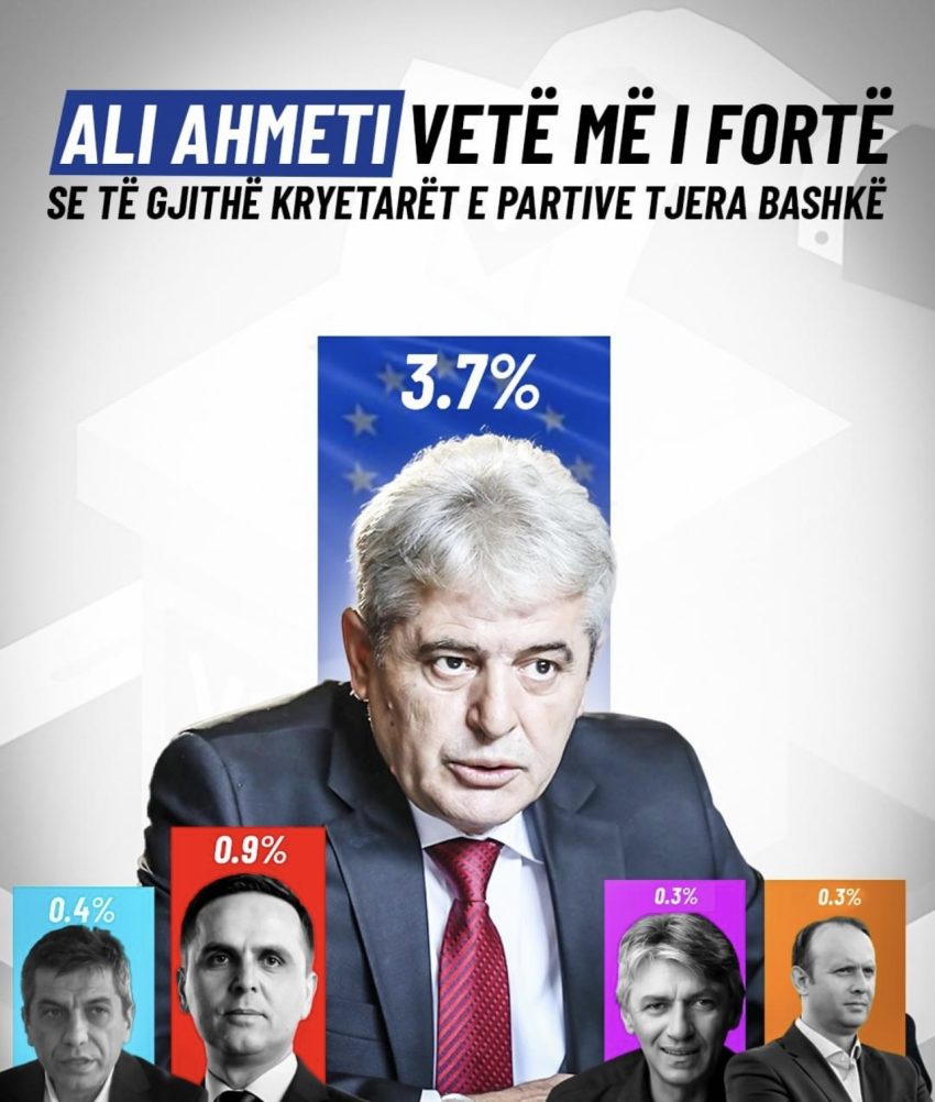 Ali Ahmeti është i pakrahasueshëm me liderët politik shqiptar, sepse sipas anketës, asnjëri nga liderët e tjerë politik në kampin shqiptar nuk gëzon as 1% të mbështetjes qytetare.