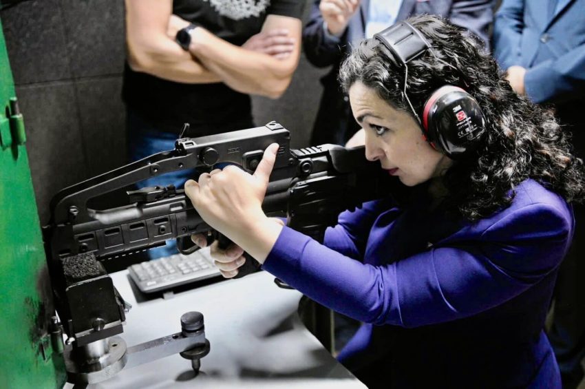 Presidentja e Kosovës, Vjosa Osmani, është parë duke provuar një armë të llojit të gjatë, VHS-2, të llojit më të ri të pushkës kroate.
