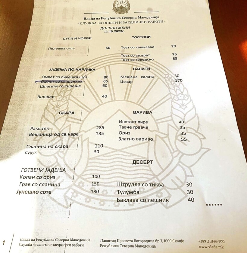“Populli shtyhet për një kore bukë, kurse Kovaçevski, Grubi, Bujari, Spasovski, Stani Caci, pinë çorbë pule për 60 denarë, rrotullojnë në pirun omëletë me mish derri për 65 denarë. Mund edhe proshutë të pjekur në skarë për 110 ose mish derri për 135 denarë. Dikush le të gjejë diku tjetër, përpos se në Qeveri për ministra, oriz me mish pule për 100 denarë, fasule me proshutë 150 denarë, ose specialitet me qafë derri për 75 denarë”.