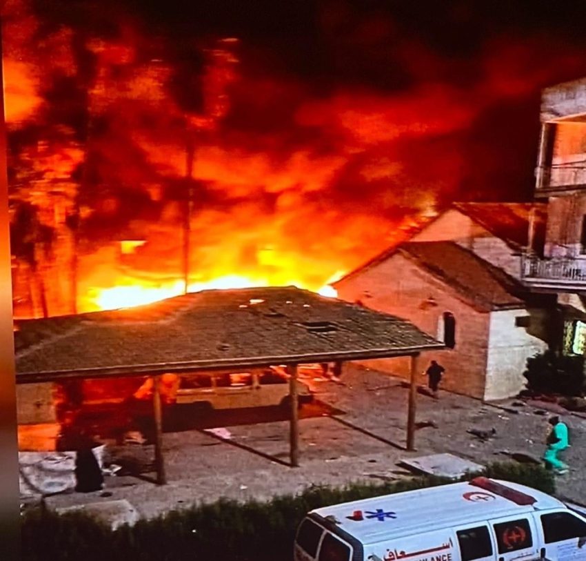 Në fotografitë e publikuara në rrjetet sociale shihet zjarr i madh në dhomat e Spitalit al-Ahli, xhama të thyer dhe copa të trupave të njerëzve nëpër zonë.