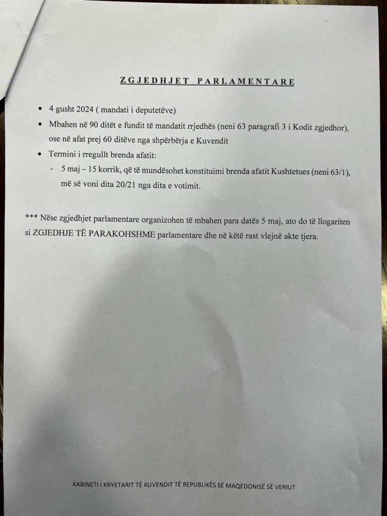 • Termini i rregullt brenda afatit: – 5 maj – 15 korrik, që të mundësohet konstituimi brenda afatit Kushtetues (neni 63/1), më së voni dita 20/21 nga dita e votimit.
