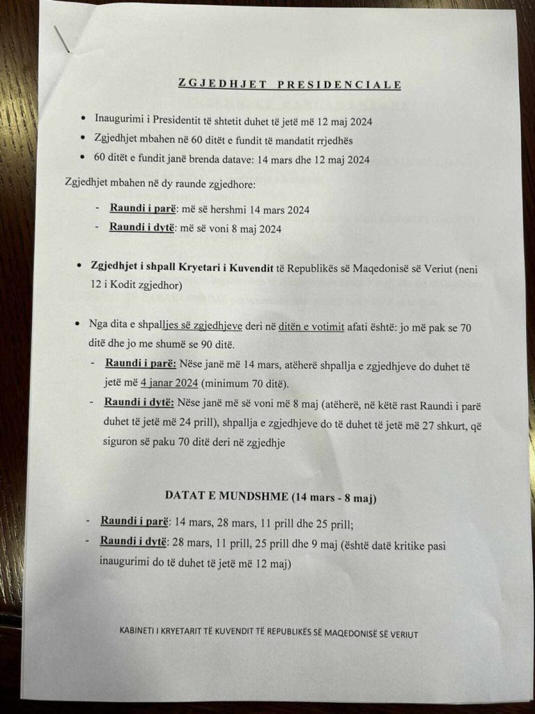 • Nga dita e shpalljes së zgjedhjeve deri në ditën e votimit afati është: jo më pak se 70 ditë dhe jo me shumë se 90 ditë. – Raundi i parë: Nëse janë më 14 mars, atëherë shpallja e zgjedhjeve do duhet të jetë më 4 janar 2024 (minimum 70 ditë). – Raundi i dytë: Nëse janë më së voni më 8 maj (atëherë, në këtë rast Raundi i parë duhet të jetë më 24 prill), shpallja e zgjedhjeve do të duhet të jetë më 27 shkurt, që siguron së paku 70 ditë deri në zgjedhje DATAT E MUNDSHME (14 mars – 8 maj) – Raundi i parë: 14 mars, 28 mars, 11 prill dhe 25 prill; – Raundi i dytë: 28 mars, 11 prill, 25 prill dhe 8 maj (është datë kritike pasi inaugurimi do të duhet të jetë më 12 maj)