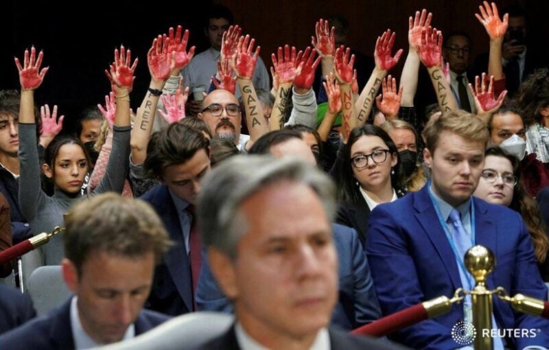 Me pankarta dhe duar të lyera me të kuqe, kjo ishte mënyra që ata kishin zgjedhur të jepnin mesazhin e tyre. Njëkohësisht kërkuan që SHBA-ja të ndalojë dërgimin e fondeve në Izrael.
