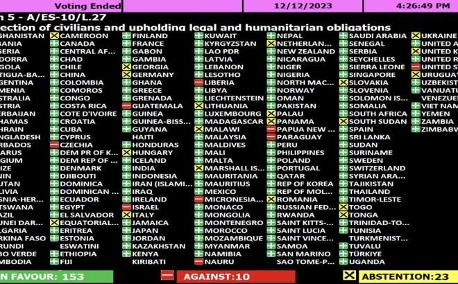 Asambleja e Përgjithshme e OKB-së miratoi një rezolutë që bën thirrje për një armëpushim të menjëhershëm në Rripin e Gazës. Për miratimin e rezolutës votuan 153 vende, 10 ishin kundër dhe 23 anëtarë të OKB-së abstenuan.