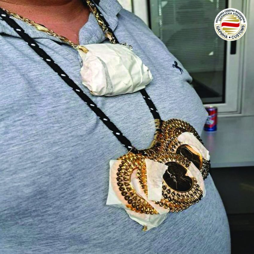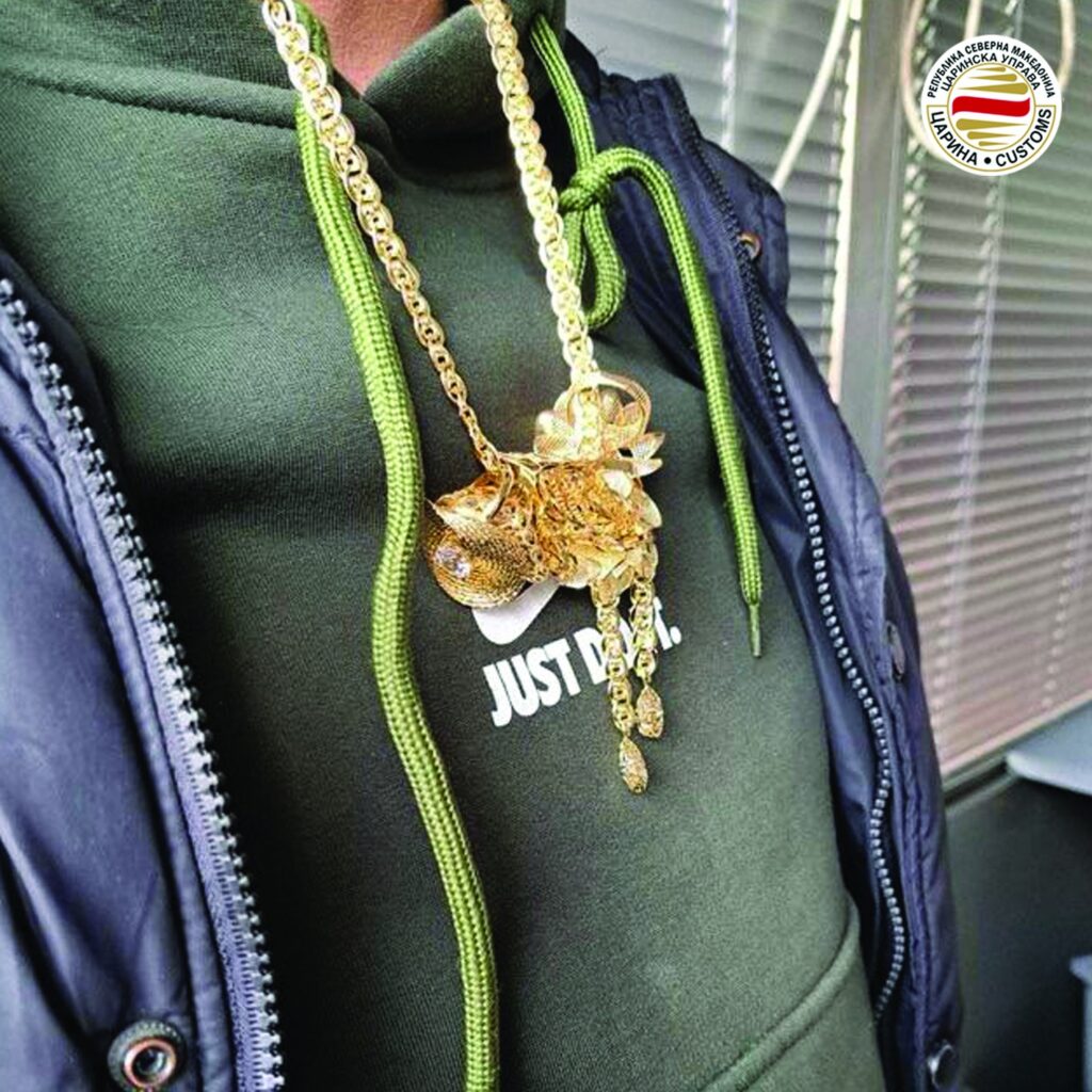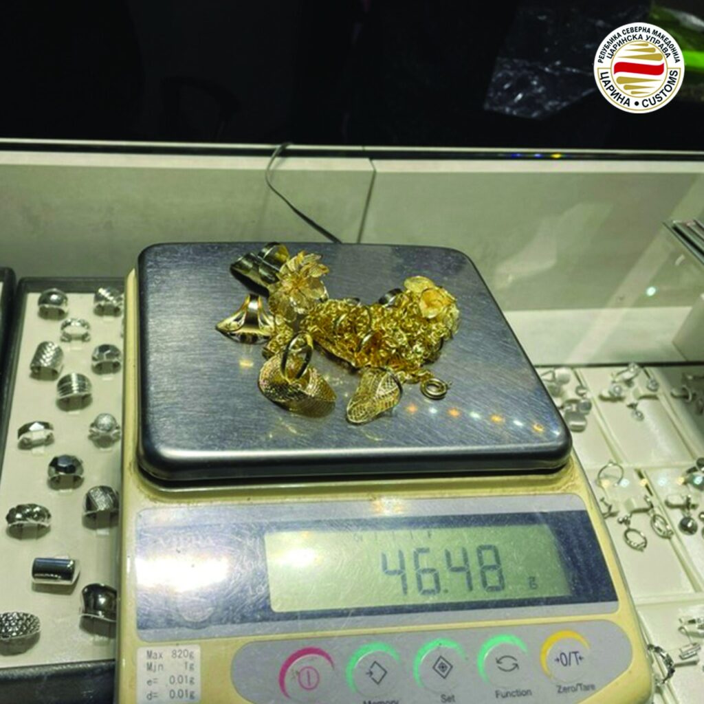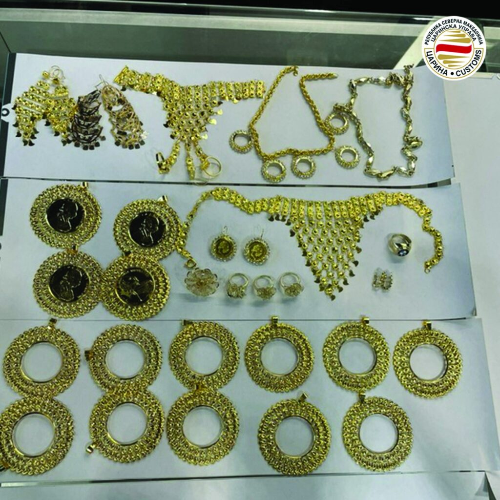 “Pasagjerët që udhëtonin me furgon në dalje të Tabanovcës janë përzgjedhur nga ekipi mobil i Departamentit për kontroll dhe hetime për kontroll të detajuar dhe tek të dy janë gjetur copa ari. Njëri prej pasagjerëve mbante në qafë një fije të zezë dhe një zinxhir në të cilin ishin ngjitur dy grumbuj bizhuteri ari të gatshme me peshë 201,82 gram, të mbështjella me shirit. Pasagjeri tjetër mbante një zinxhir në qafë me një tufë unaza të ngjitura, me peshë 46.48 gram”.Malli është sekuestruar përkohësisht dhe kundër tyre do të ngrihet kallëzim përkatës, me ç’rast njëri nga pasagjerët do të akuzohet për kallëzim penal dhe tjetri për kundërvajtje”, thuhet në njoftim.