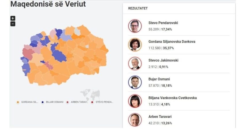 Kandidatja e VMRO-DPMNE-së, Gordana Siljanovska, është duke udhëhequr me 160.884 vota, ose 36.99% të votave.