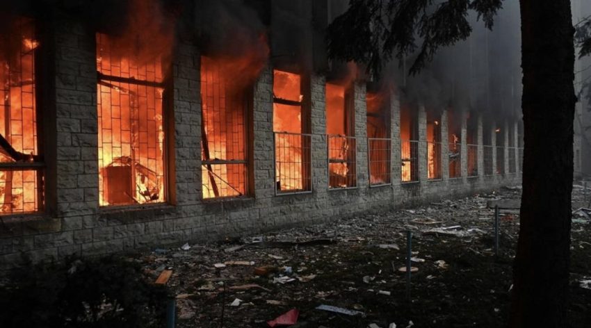 Ekipet emergjente shuan zjarrin në një ndërtesë të goditur nga fragmentet e dronëve të rrëzuar, por situata është nën kontroll.