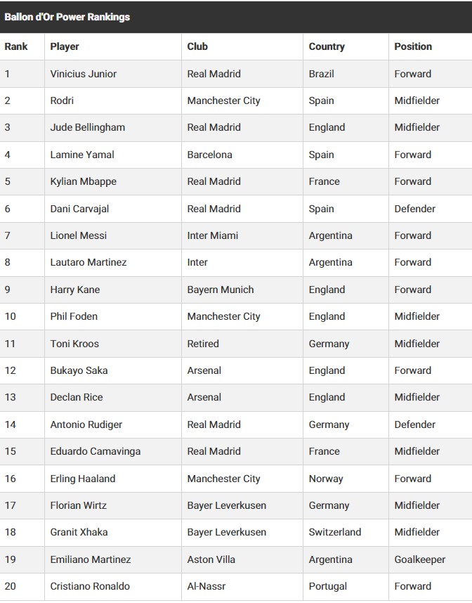 Në pozitën e tretë është mesfushori anglez Jude Bellingham, derisa ngritje të madhe në listë ka pasur sensacioni Lamine Yamal që tani ndodhet në pozitën e katër.