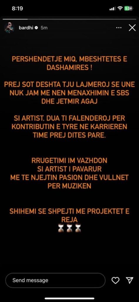Artisti nga Kumanova, Bardhi ka njoftuar se tashmë edhe në mënyrë zyrtare nuk është më nën menaxhimin e Jetmir Agajt. Në një postim në Instastory ai ka shprehur mirënjohjen për vitet e punës që kanë patur bashkë prej fillimit të tij të karrierës, por shton se tashmë është një artist i pavarur që do të vazhdojë me projektet muzikore, normalisht.