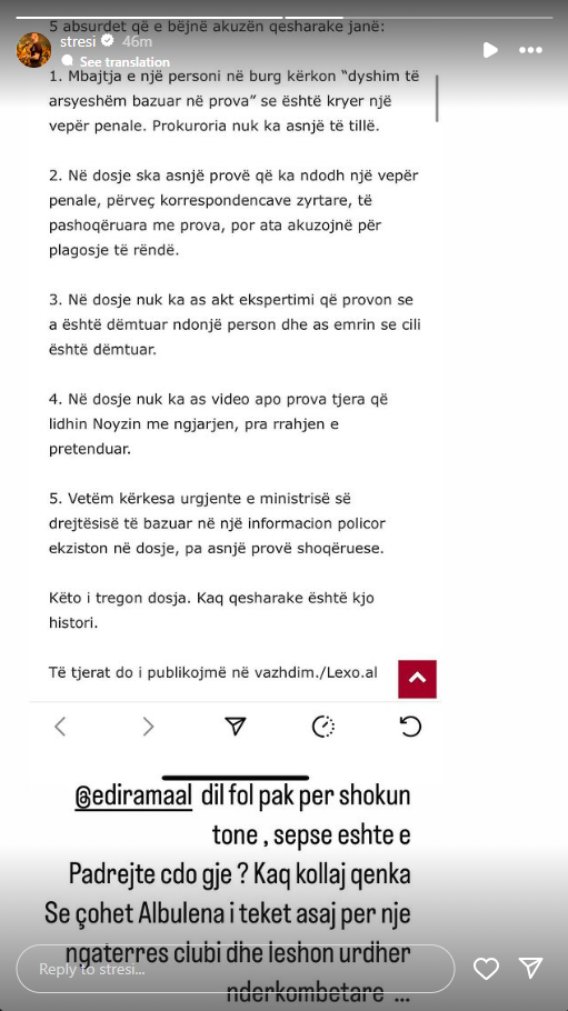 “Edi Rama dil fol pak për shokun tonë, sepse është e padrejtë çdo gjë. Kaq kollaj qenka se çohet Albulena (ministrja e Drejtësisë në Kosovë) i teket asaj për një ngatërresë klubi dhe lëshon urdhër ndërkombëtar”, ka shkruar Stresi.