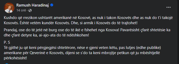 Në një shkrim në platformën sociale Facebook, ai tha se kushdo që rrezikon ushtarët amerikanë në Kosovë, as nuk i takon Kosovës dhe as nuk do t’i takojë Kosovës, por është vetëm kundër Kosovës – dhe si armik i Kosovës do të trajtohet!
