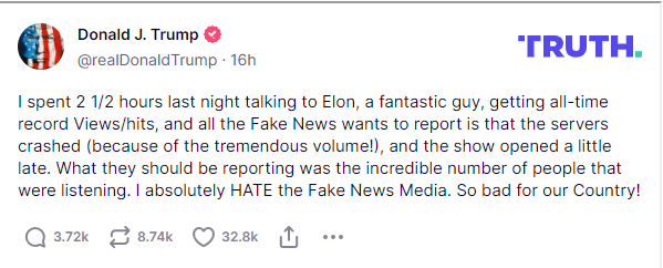 “Kam kaluar 2 orë e gjysmë mbrëmë duke folur me Elonin, një djalë fantastik, duke marrë rekord shikimesh/hite të të gjitha kohërave dhe gjithçka që Fake News dëshiron të raportojë është se serverët u rrëzuan (për shkak të volumit të jashtëzakonshëm!) dhe shfaqja u hap pak me vonesë. Ajo që duhet të raportonin ishte numri i jashtëzakonshëm i njerëzve që po dëgjonin. Unë absolutisht e urrej median e lajmeve të rreme. Sa keq për vendin tonë!”, shkroi Trump në rrjetin personal social, Truth Social.