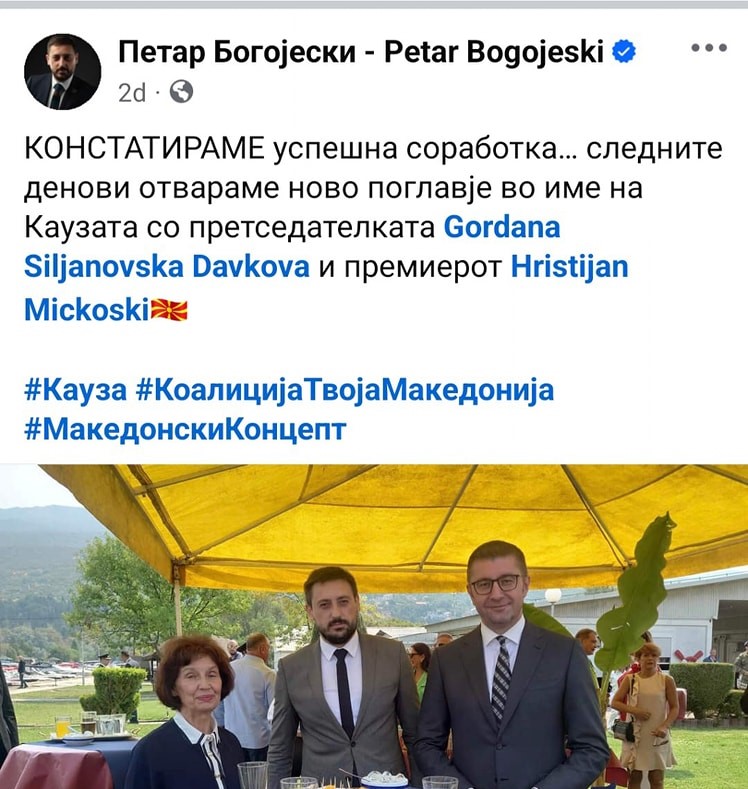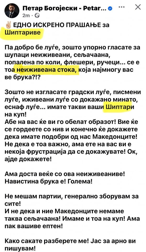 Njëri nga partnerët e koalicionit, Petar Bogojeski, mik i kryeministrit dhe presidentes, ofendon rëndë shqiptarët dhe kjo kalon si diçka normale pa i penguar askujt. Në fakt ky është rreziku i vërtetë për tensione dhe jo e drejta e shqiptarëve për tu mbrojtur dhe për të ngritur zërin kundër nënçmimeve dhe ofendimeve si këto. Kryeministri Mickoski, skenaristët e tensioneve i ka në krahun e tij të djathtë.
