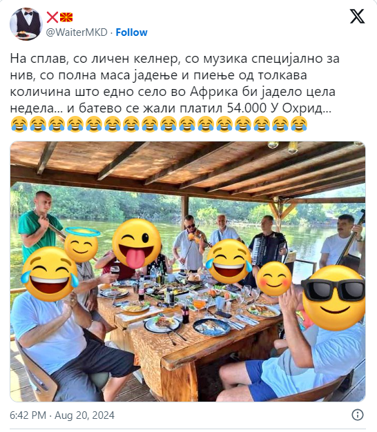 “Në mes të ujit, me një kamarier personal, me muzikë posaçërisht për ta, me një tavolinë plot me ushqim dhe pije në një sasi të tillë që një fshat në Afrikë do të hante për një javë të tërë… dhe ky po ankohet se ka paguar 54,000 në Ohër.” ka shkruar ai.