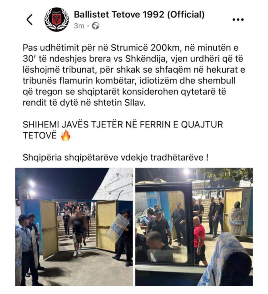 “Pas udhëtimit për në Strumicë 200km, në minutën e 30’ të ndeshjes brera vs Shkëndija, vjen urdhëri që të lëshojmë tribunat, për shkak se shfaqëm në hekurat e tribunës flamurin kombëtar, idiotizëm dhe shembull që tregon se shqiptarët konsiderohen qytetarë të rendit të dytë në shtetin Sllav.  SHIHEMI JAVËS TJETËR NË FERRIN E QUAJTUR TETOVË 🔥 Shqipëria shqipëtarëve vdekje tradhëtarëve !”, thonë Ballistët.